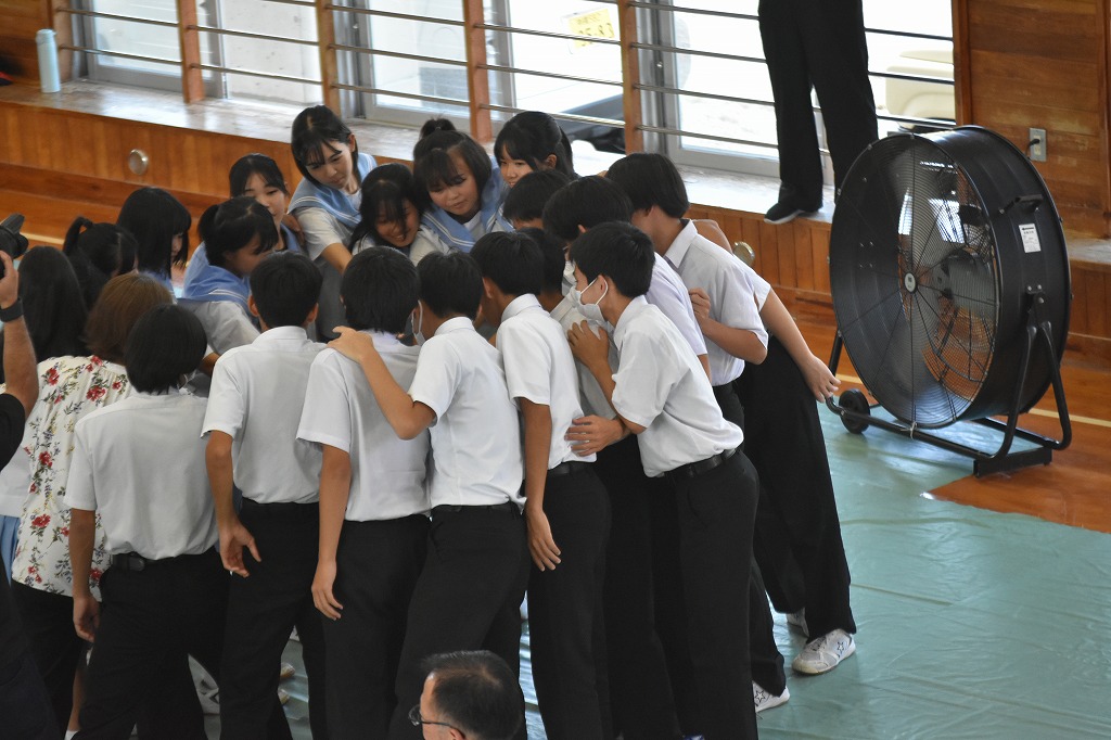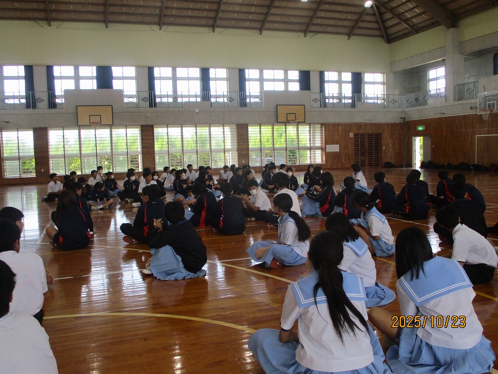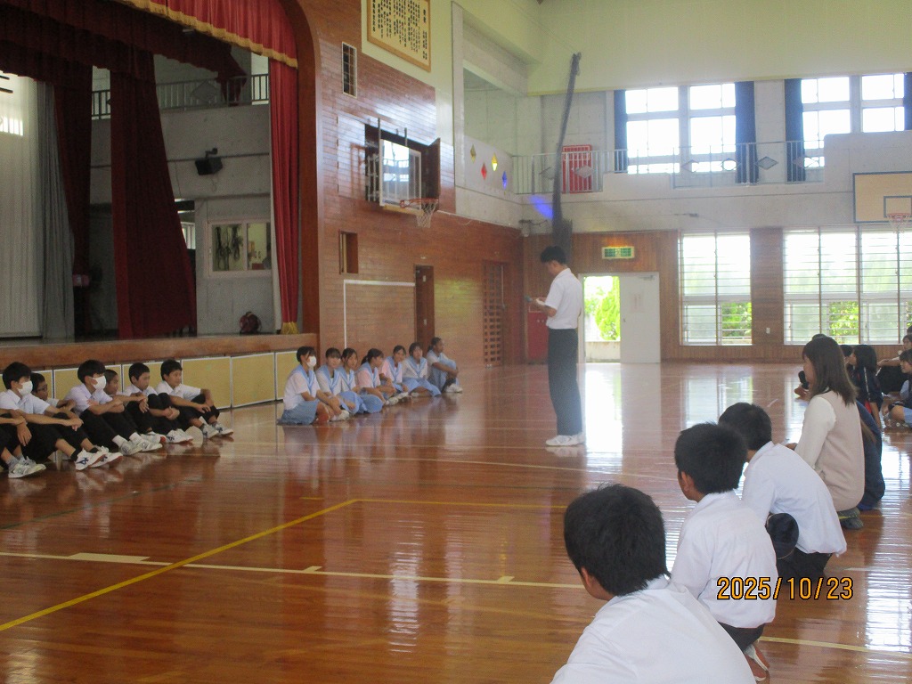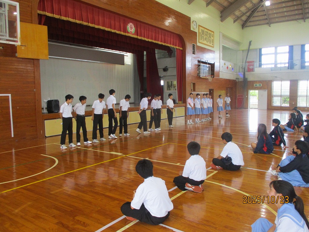 男子第50回、女子大41回国頭地区中学校駅伝競走大会が10月25日(土)今帰仁村運動公園を中心に開催されます。(スタート時刻 女子9:00、男子10:20予定)大会に向け、選手激励集会を本校体育館にて10月23日(木)午後より行いました。夏休み前より、日々練習を行い、暑い中でも頑張ってきました。男子、女子共に上位を目指しています。練習の成果を期待しています。頑張れ、国中。