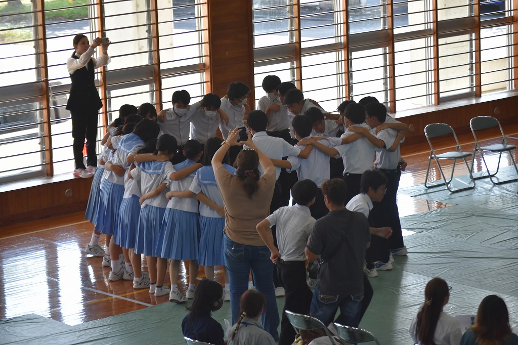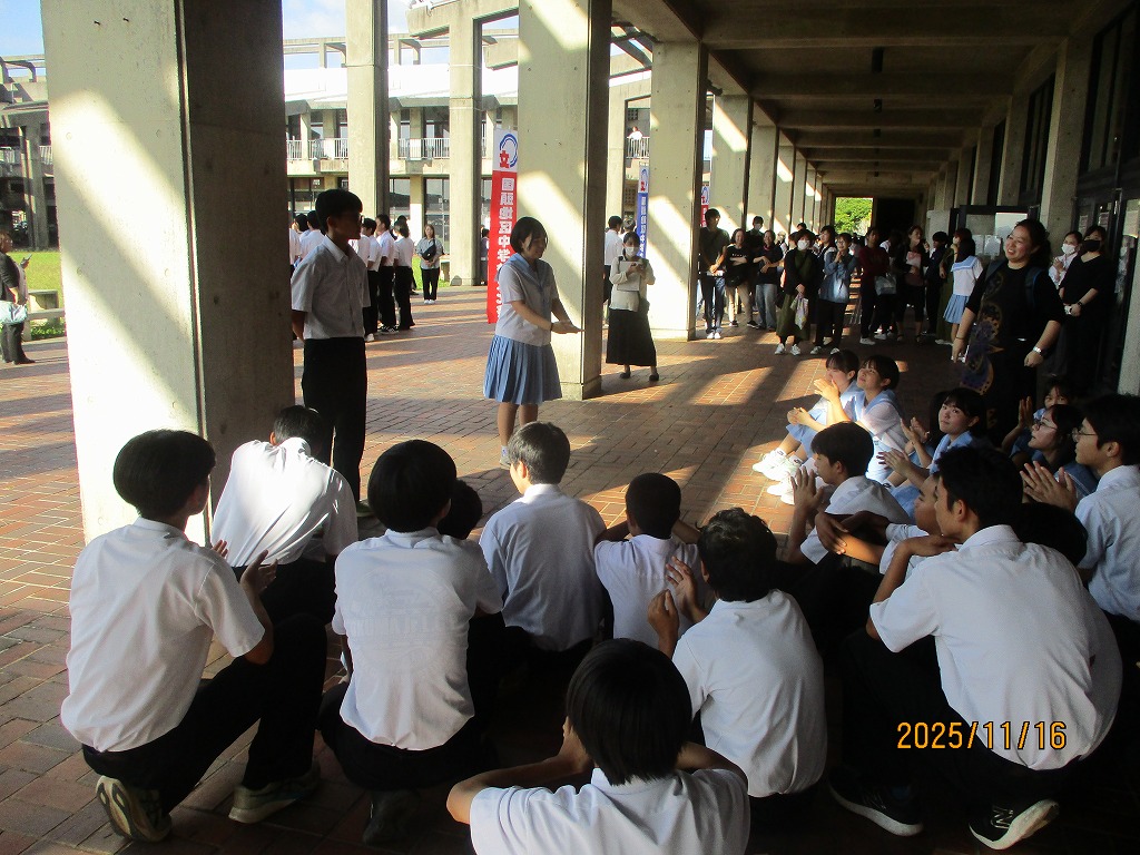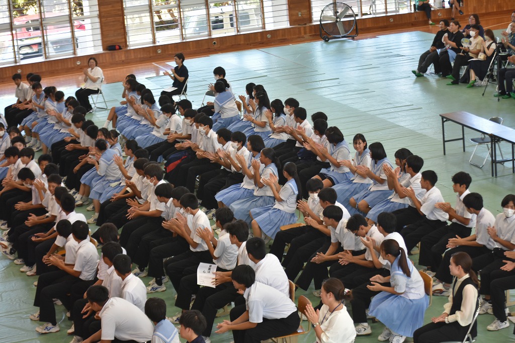 6月24日(火)4校時、「株式会社さびら」の安里拓也さんを講師に「平和教育講演会」を行いました。安里さんは講話の前にグラウンドルールとして①『「なぜ」という疑問をもつ』。②『「自分だったら・・・・」を考える。③「周りの人と、意見や疑問をシェアする」の3点の視点をもち、講話を聞くようにお願いしていました。講話では「沖縄戦が実際始まったのはいつか・・・」「なぜ、無血上陸できたのか」、や「シュガーローフの戦い」等、生徒の皆さんにいろいろ問いかけながらお話をしてくださいました。生徒を代表して2年生のかなとさんは「私たちが友達と笑い合い、毎日を普通に過ごせていることは幸せなことなんだ。この平和を守り続けていくために私達一人一人が平和について考え、お互いを思いやり、認め合いながら今できることを行動にうつしていくことが大切だと感じました。」と感想を述べ、平和について改めて考えを深めたようでした。