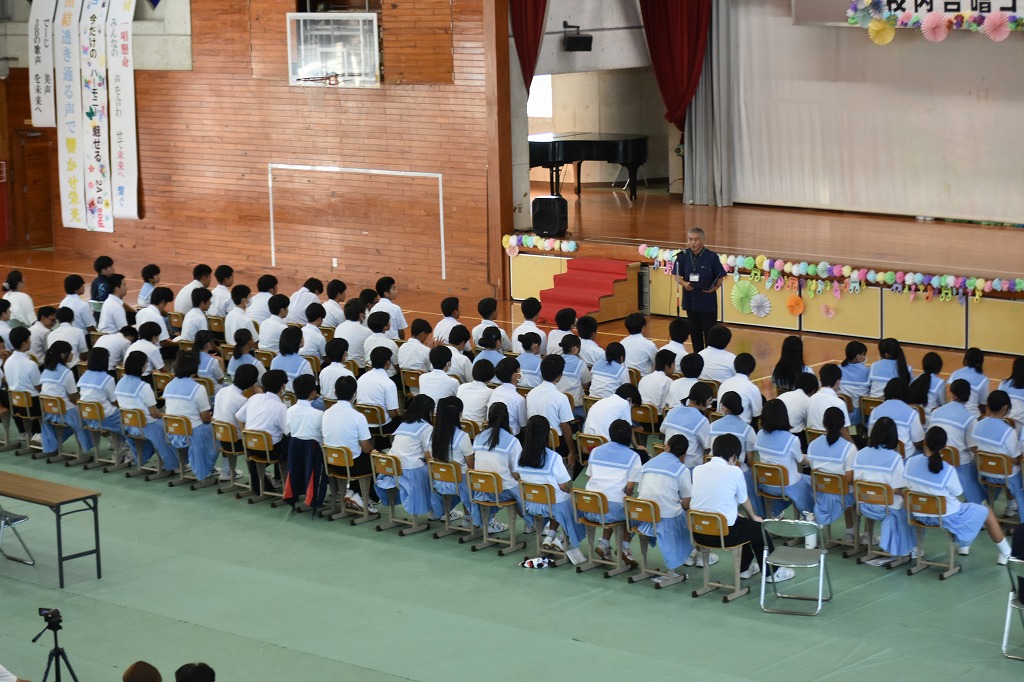 六月六日(金)午後、体育館にてCSC協議会(子どものスマホ・スマイル協議会)の高宮城修氏を講師に、サイバー犯罪防止講演会を実施しました。「時代が変わり、法律も変わる。少し前までは大丈夫だったことが今では犯罪につながる」、「肖像権侵害・デジタルタトゥーのこと」や「名誉棄損罪・侮辱罪」等、SNSやライン等のことなど、いろいろなお話をしてくださいました。また、夢を叶えるためには「寝る1時間前からスマホはしない」や「勉強中、睡眠中のとき近くにスマホをおかない」など、これから将来の夢へ向かってがんばってほしいことなど話してくれました。最後に生徒を代表してまひろさんよりお礼の言葉がありました。「スクショのことやライングループのこと」など述べてくれました。スマホは便利ではありますが「依存にならないよう」「犯罪に巻き込まれないよう」使い方に注意して安全に使用し、自ら身を守ることも大事にしてほしいと思います。