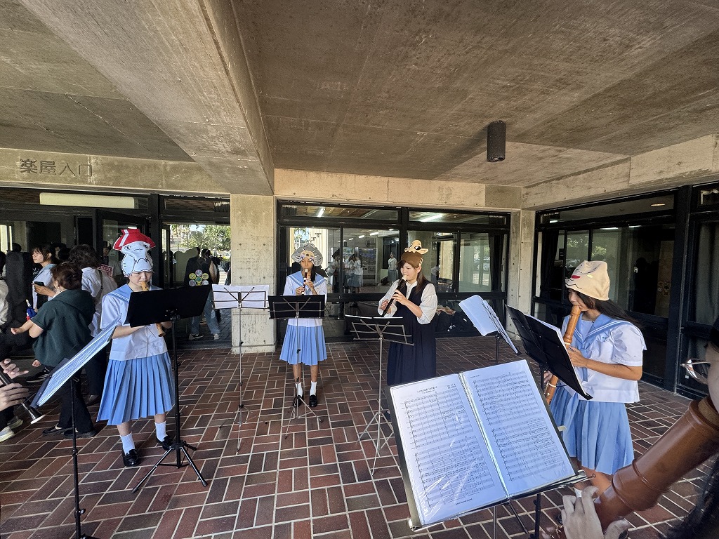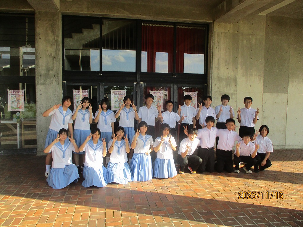 去る11月16日(日)に地区中学校総合文化祭(午前)と地区中学校音楽発表会(午後)が名護市民会館にて開催されました。本校からは文化祭に1年生5名でリコーダー演奏「碧い海」「いのちの名前」を披露しました。とても緊張した様子でしたが、一生懸命演奏する姿が素敵でした。もた、3年生のあうらさんが、他校の生徒3名と一緒にハワイアンダンス ヒロフラ を披露しました。笑顔を絶やすことなく、楽器も3種類演奏しながらハワイのダンスを明るく演技してくれました。両方とも演技後には会場から大きな拍手がありました。ありがとうございました。また、午後の音楽発表会では、3年A組さんと2年A組さんが参加し、それぞれ「時を超えて」と「14-fourteen」を披露しました。校内合唱の時よりも、素晴らしいハーモニーで大きな成長がありました。会場からも大きな拍手がありました。残念ながら県大会には選ばれませんでしたが、素晴らしい合唱に大きな感動をありがとうございました。