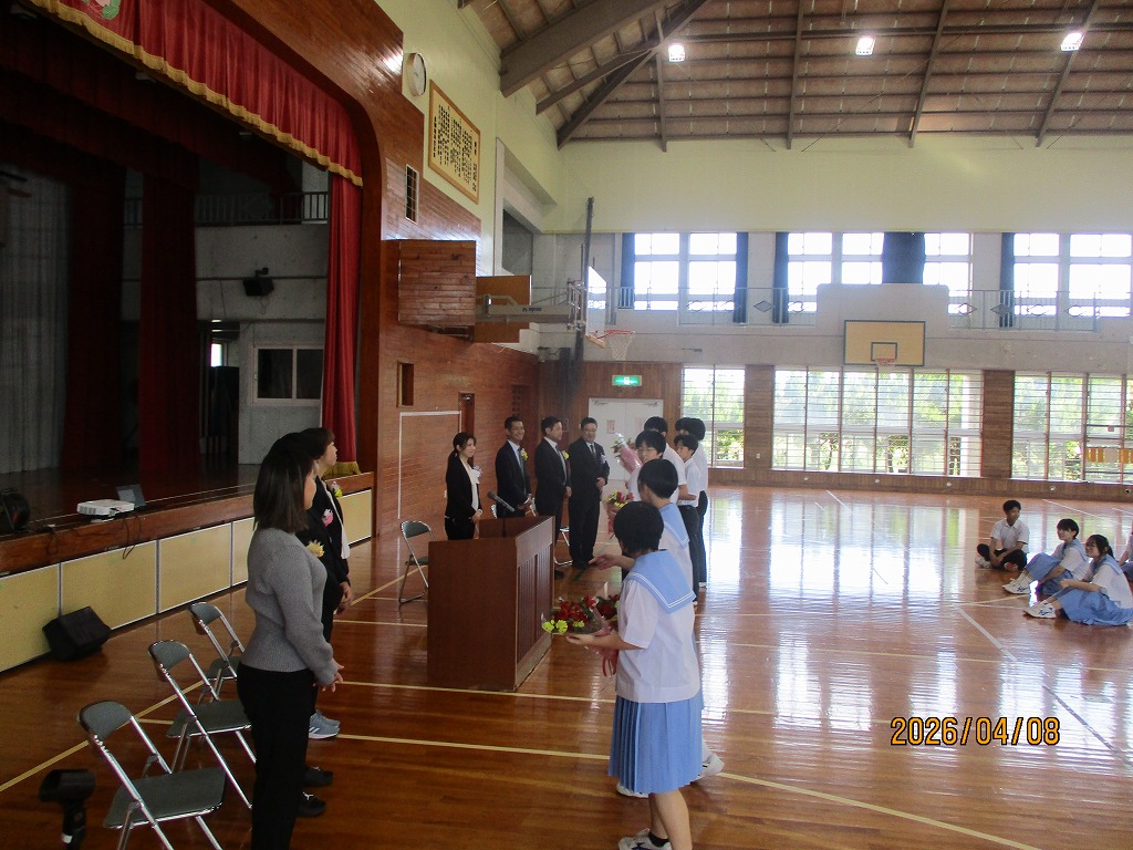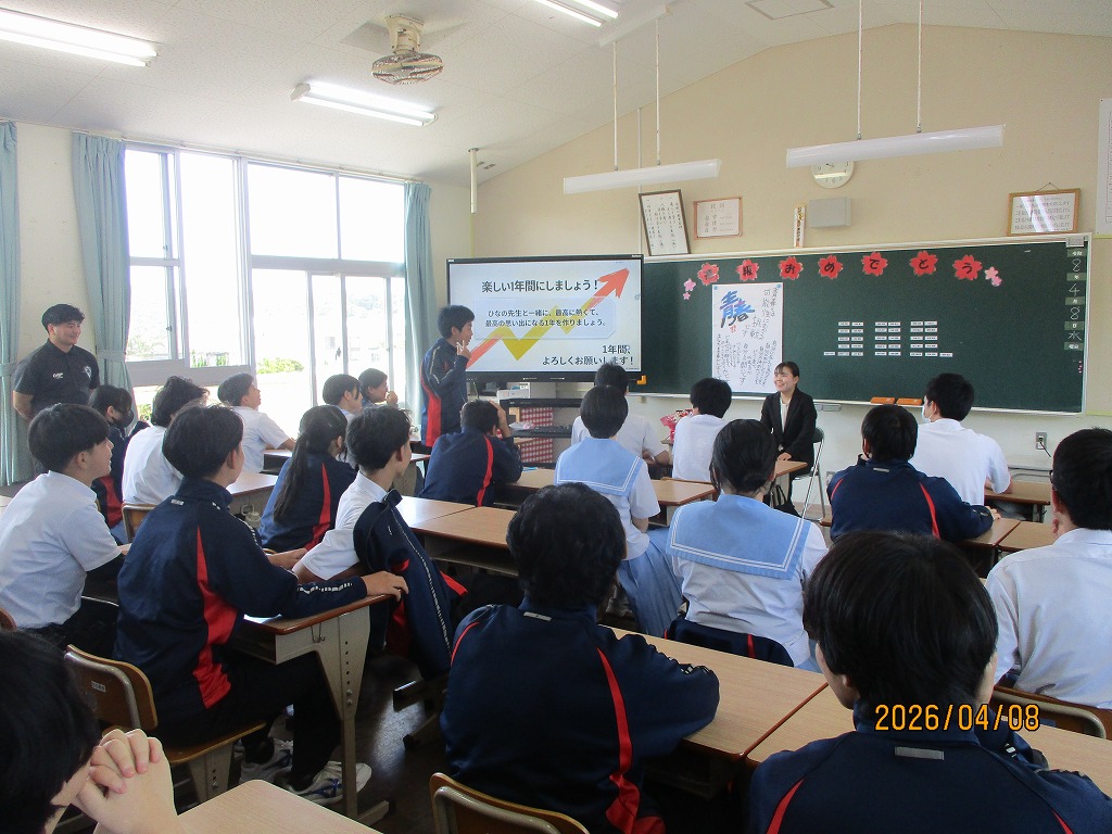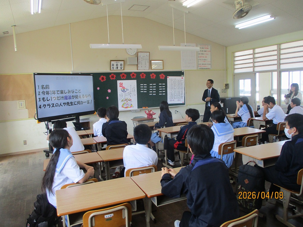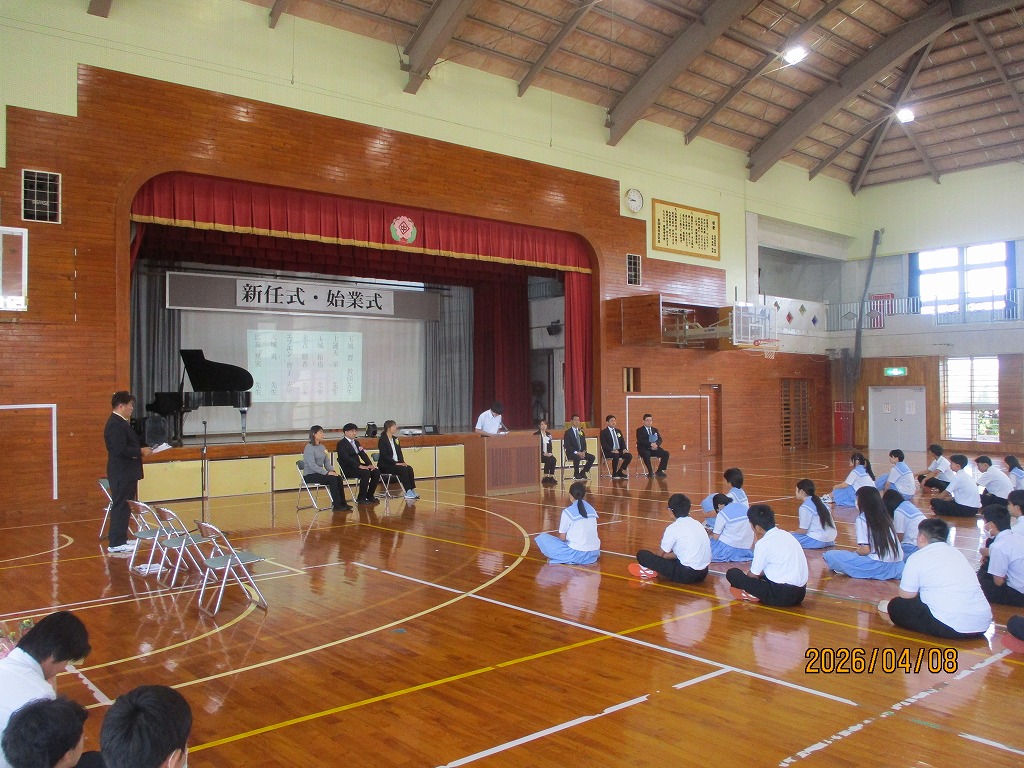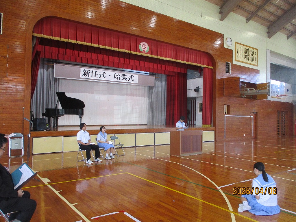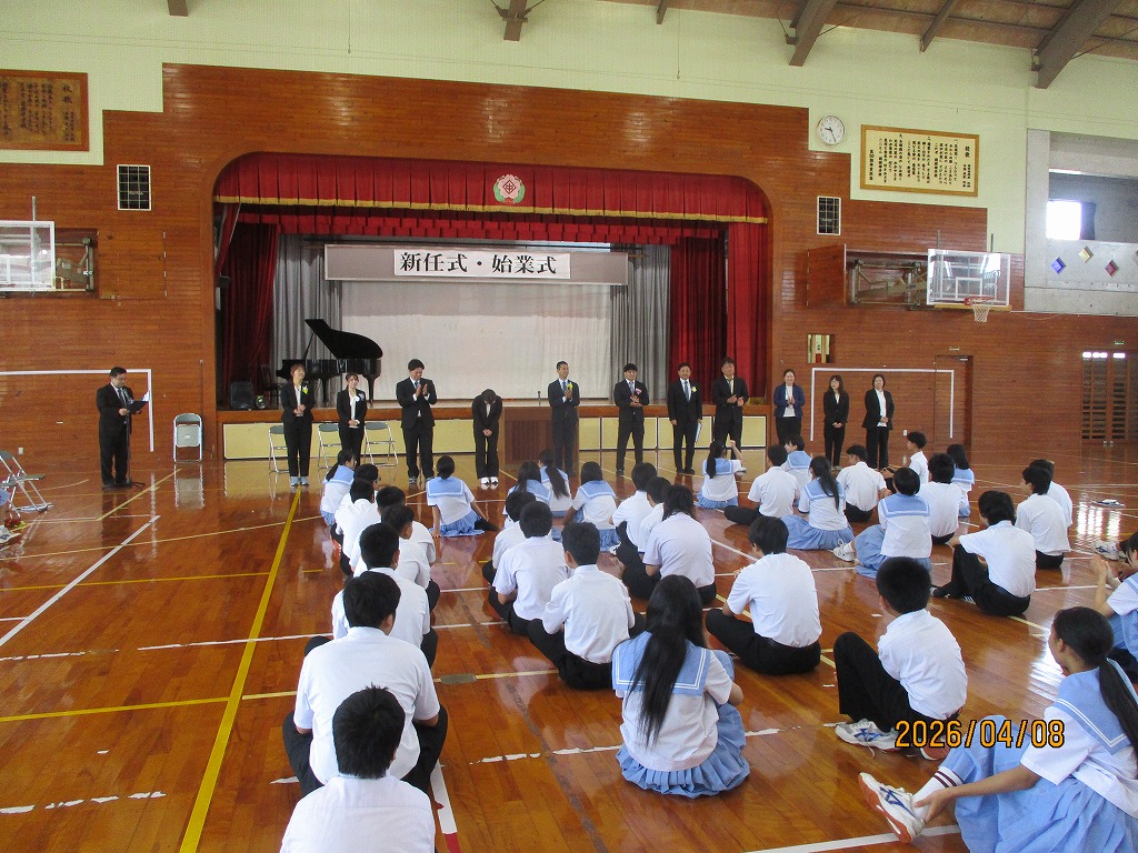 4月8日〈水〉の午前の時間帯に、体育館にて令和8年度の新任式・始業式を行ないました。新任式では7名の先生方をお迎えし、生徒会より花束の贈呈がありました。お一人ずつあいさつがあり、2,3年生の皆さんは落ち着いた雰囲気で先生方の話を聞いていました。新任式のあとは一学期の始業式を行ないました。各学年代表あいさつと生徒会執行部代表のあいさつがありました。みなさんそれぞれ新年度の決意を述べていました。式後は、教頭先生より担任の発表などがあり、発表のたびに一喜一憂する姿が印象的でした。その後、各学級で学級開きを行ない、午後は明日の入学式の準備をしました。令和八年度のスタート、各学年頑張っている姿が印象的でした。